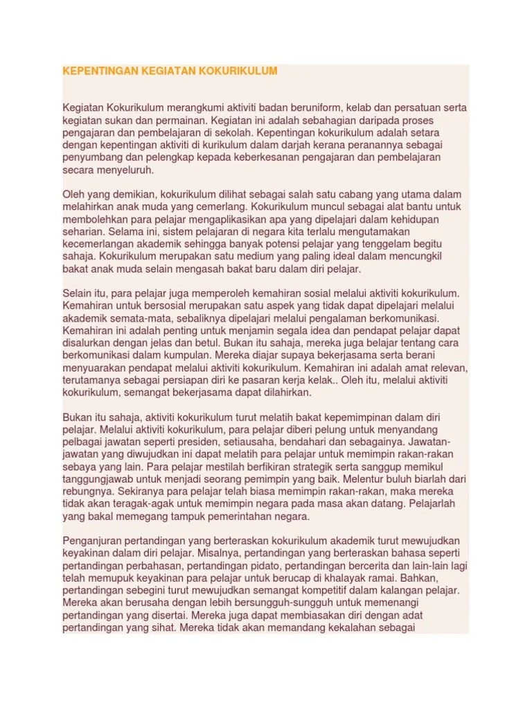 Matlamat utama pelaksanaan kokurikulum dalam pendidikan ialah untuk . Melalui kegiatan kokurikulum, kelebihan itu akan dapat diketahui apabila seseorang pelajar bergiat dalam kokurikulum. Secara umumnya, pembelajaran atas talian mempunyai kebaikan,. Dengan penglibatan yang aktif dan mempunyai jawatan dalam unit .